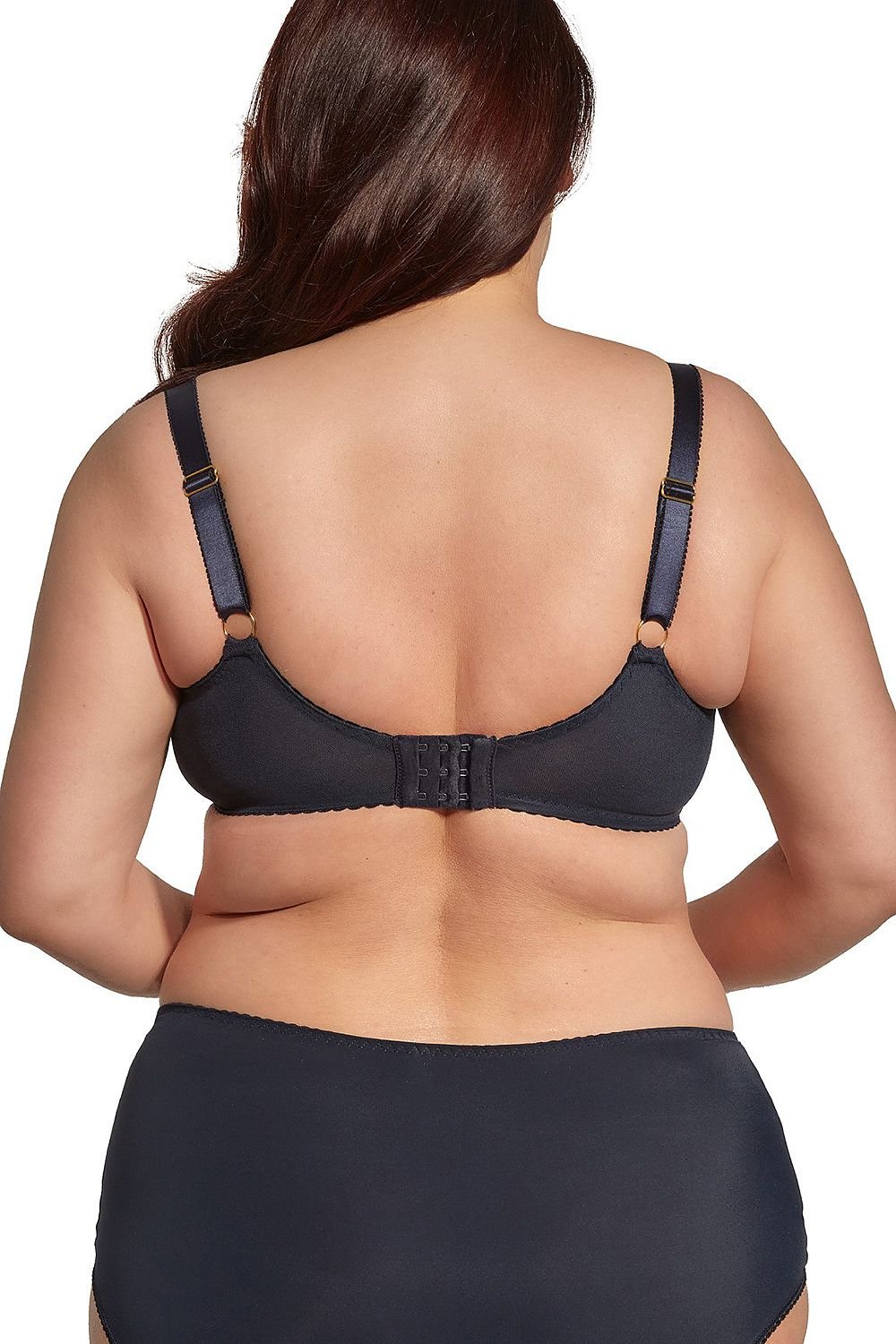A sensual soft bra, dedicated to women with fuller shapes. Dark navy blue embroidery with a sophisticated pattern, emphasizes elegance. Double reinforced side part provides exceptional stability and gathers the bust to the center. The lower part of the cup lined with soft stable mesh adds lightness to the lingerie. Movable side whalebones guarantee the fit to the body movement and increase the comfort of wearing. Thanks to the triple cut of the cup, the breasts are rounded in a natural way. Triple hook-and-eye in all sizes, it is sewn with smooth microfiber.