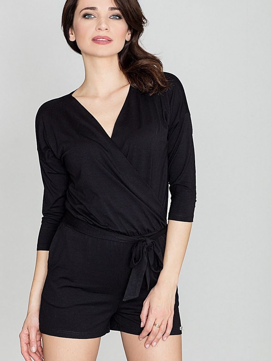 Overalls made of comfortable to wear knitwear. Model with 3/4 sleeves, envelope cut with a deep V neckline that lengthens the silhouette. It has drop pockets on the sides. The waist is emphasized with a tied belt, and the trousers are short.