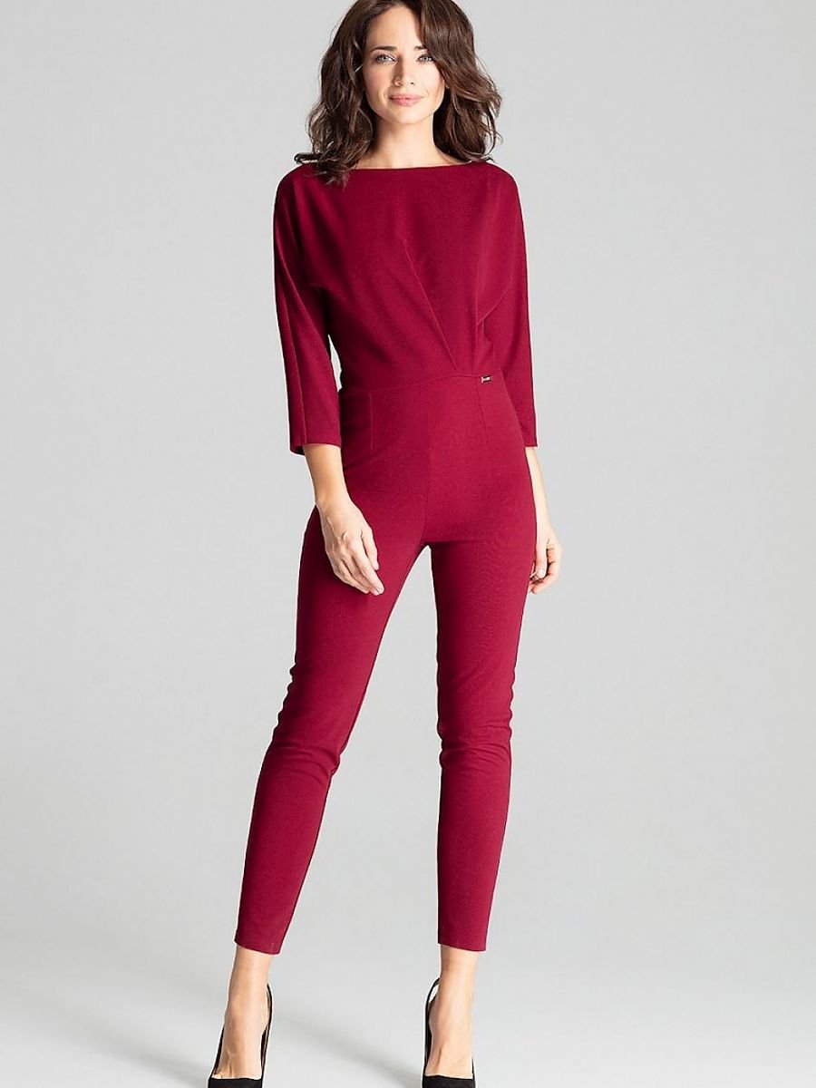 A burgundy 3/4 sleeve jumpsuit with a semi-circular neckline and asymmetrical pleats. Kimono sleeves, legs slightly tapered at the bottom. No pockets, fastened at the back with a covered zip.