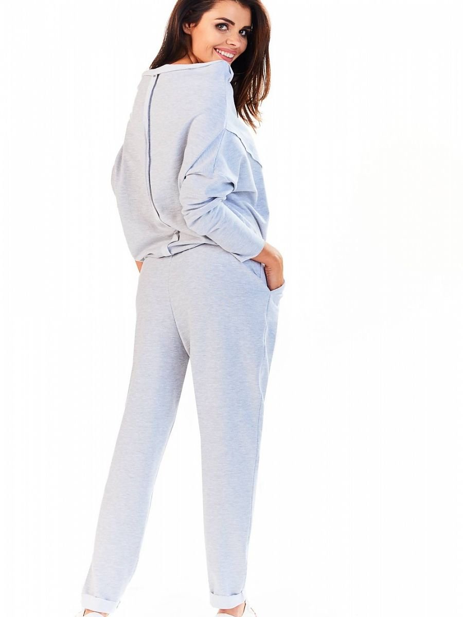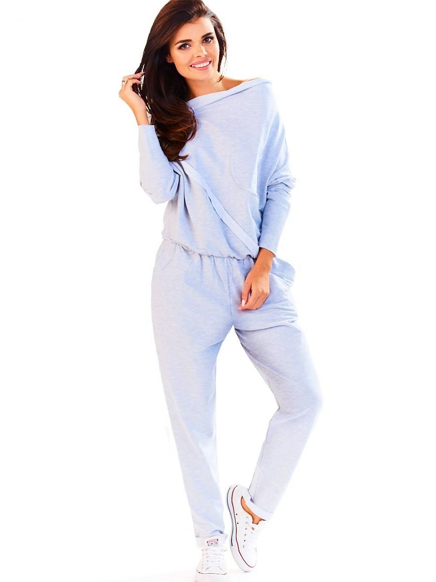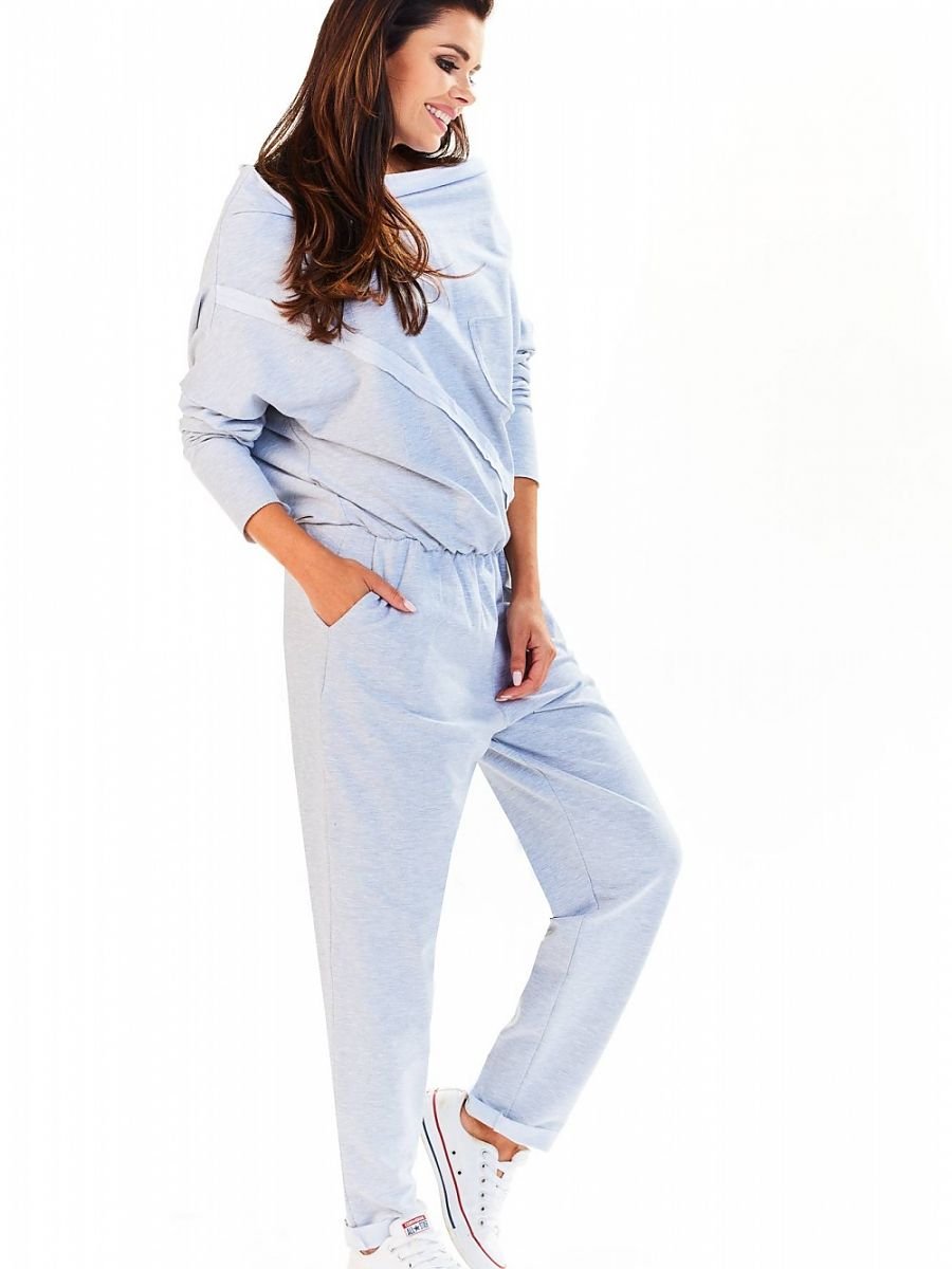 Loose-fitting tracksuit with a boat neckline. On the height of the bust pocket, at the waist elastic band.