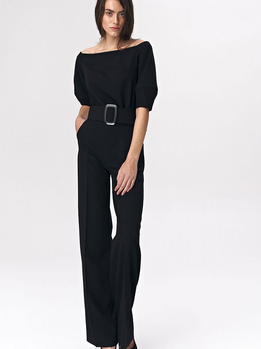 Black women's suit is a perfect alternative to classic office outfits. The sensual cold-shoulder cut beautifully exposes the shoulder line, while the wide belt with a spectacular buckle emphasizes the waist. Pleasant to the touch fabric with a blend of viscose ensures a high comfort of wearing.
