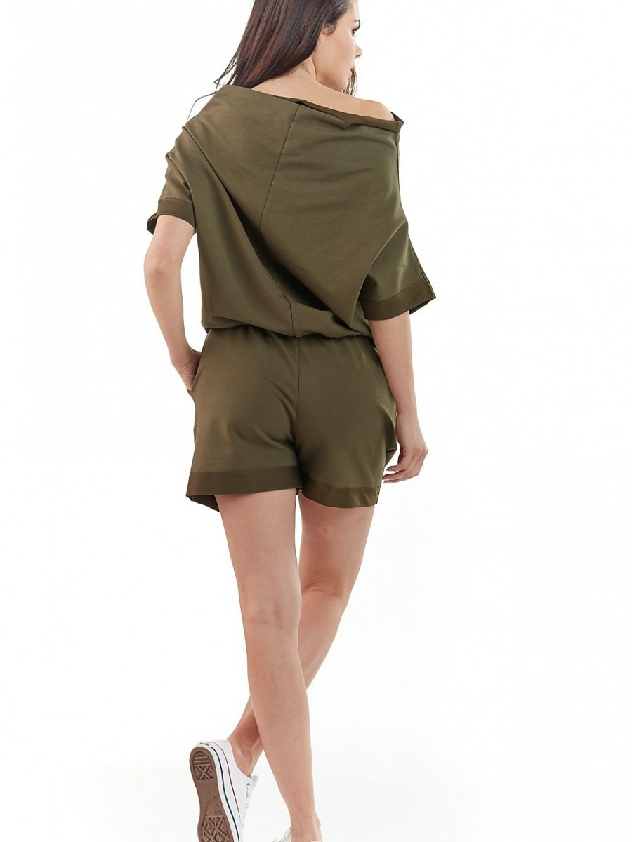 Jumpsuit with short sleeves and legs. Elastic waistband. Designed and sewn in Poland.
