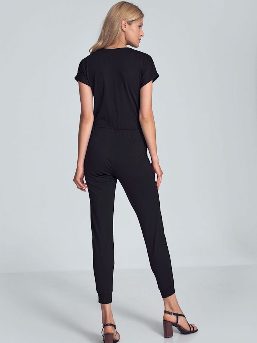 Black jumpsuit in a sporty cut, with an envelope neckline, a sewn-in elastic band at the waist, and tapered legs finished with a welt. Pockets at side seams.