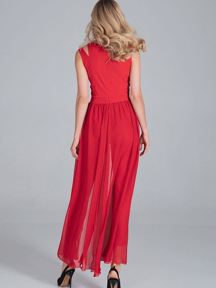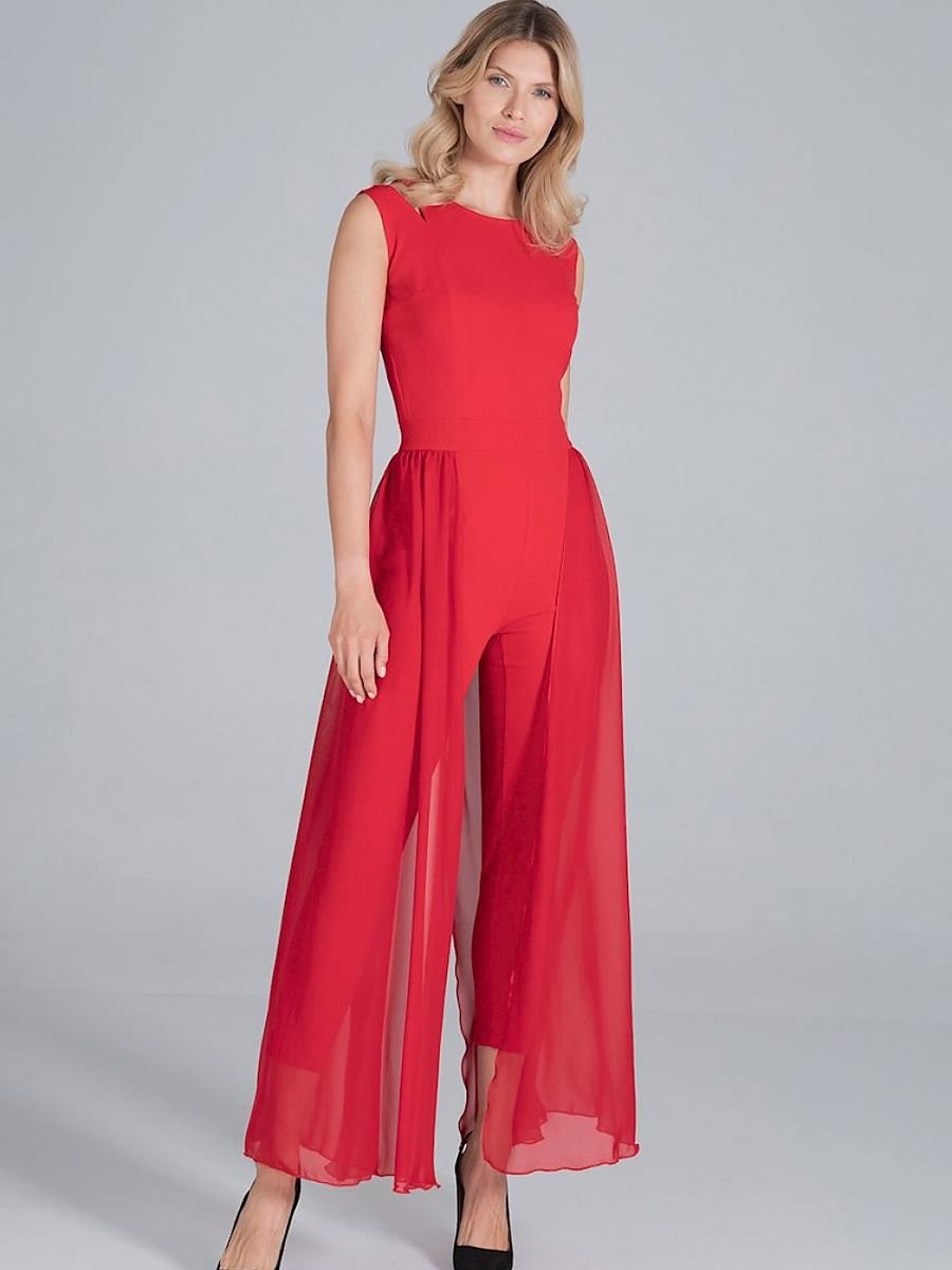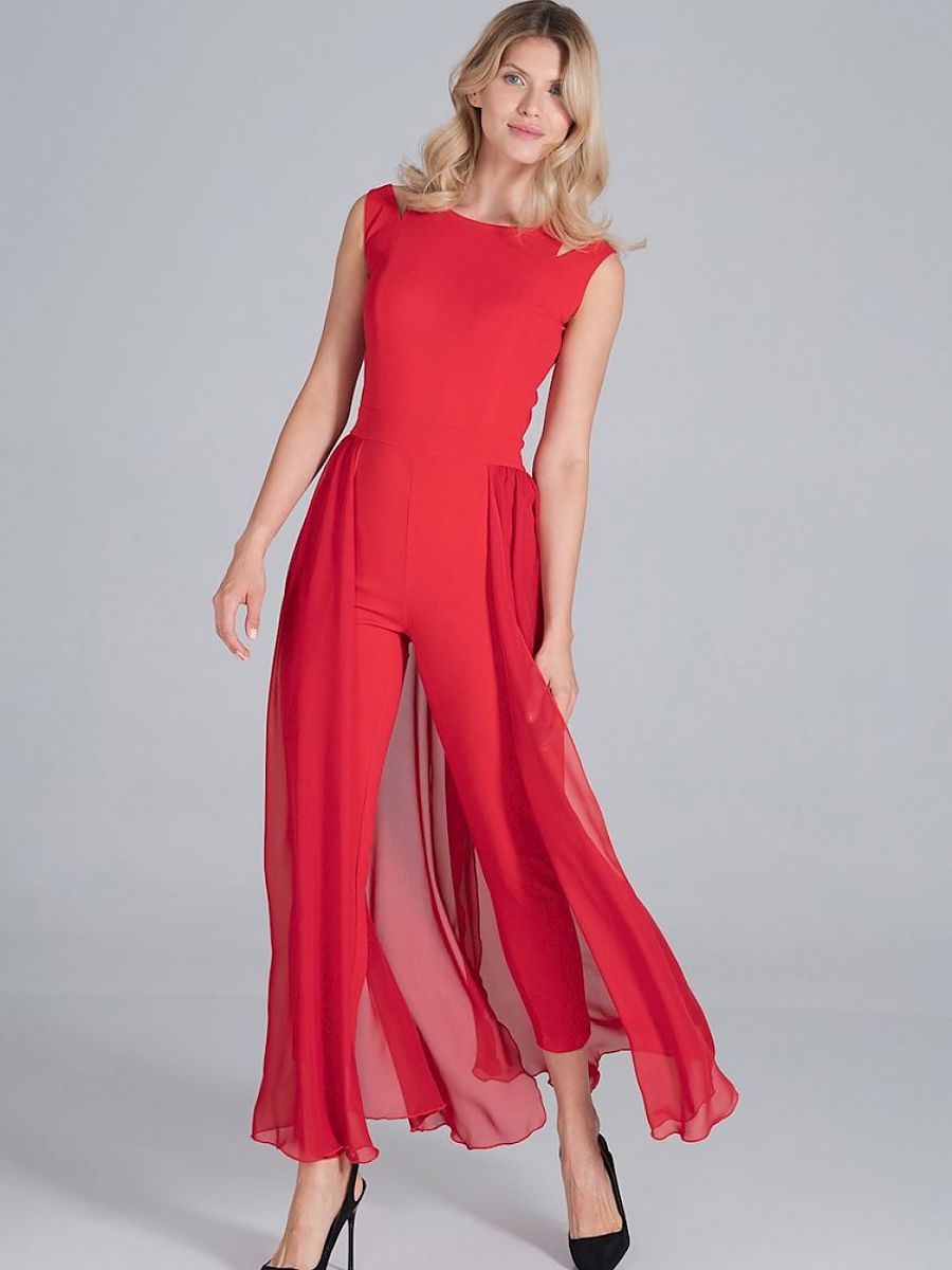 Jumpsuit with long chiffon skirt slit at the back. Sleeveless, with decorative slits at the shoulders and a small semi-circular neckline. The legs are tapered at the bottom. Fastened at the back with a long covered zip.