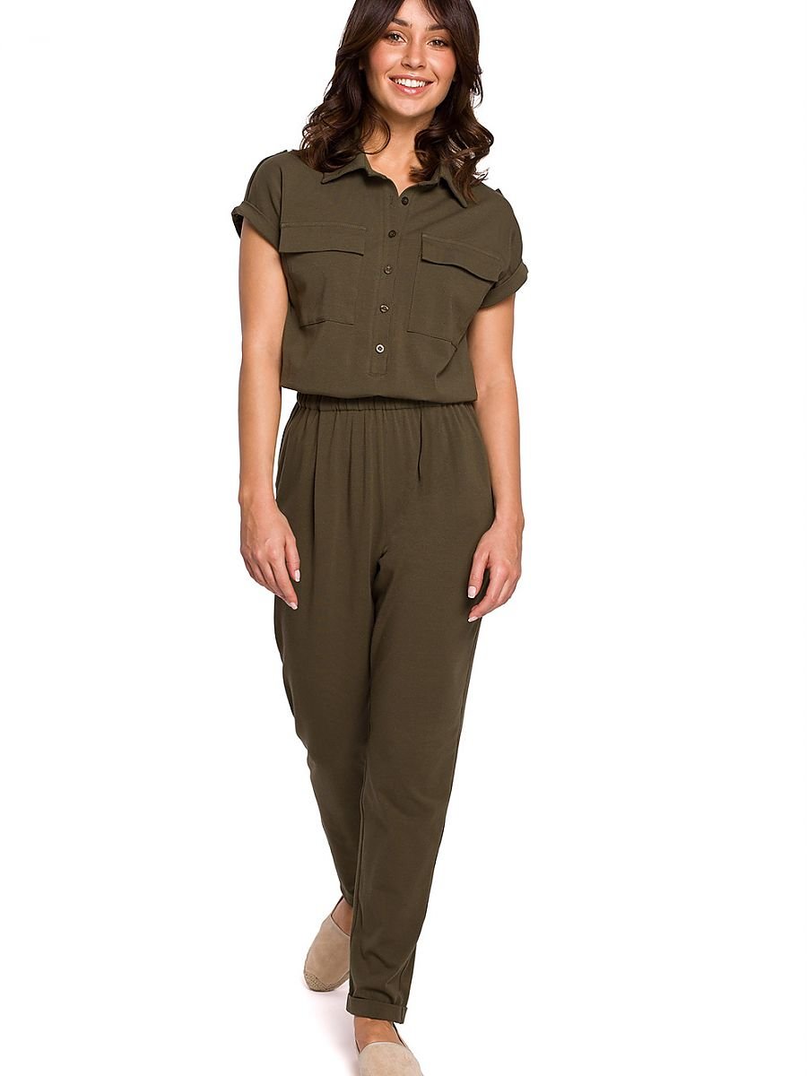 Practical, casual and great looking, jumpsuit with safari style pockets and collar. Overalls buttoned, drawstring waist. Made of pleasant to the body cotton knitwear provides a good look and comfort of wear.