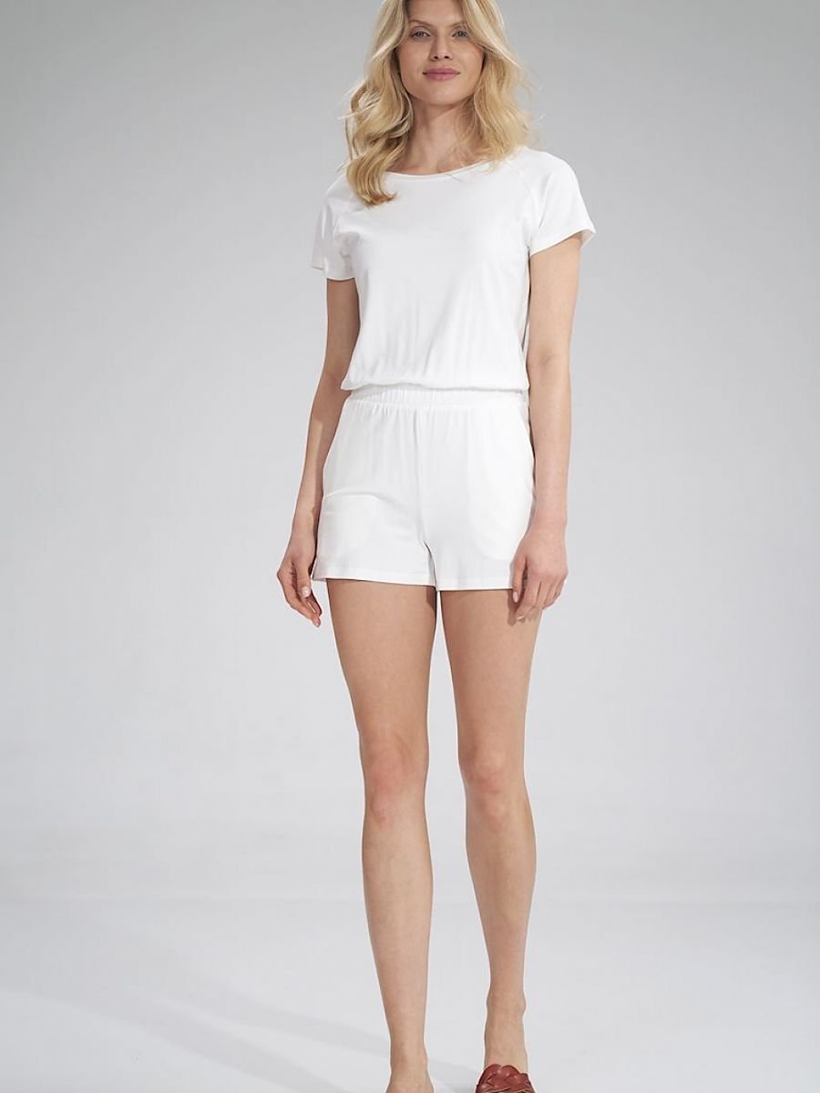 Summer jumpsuit with short legs, pockets, a semicircular neckline, short sleeves, a wide elastic waistband.