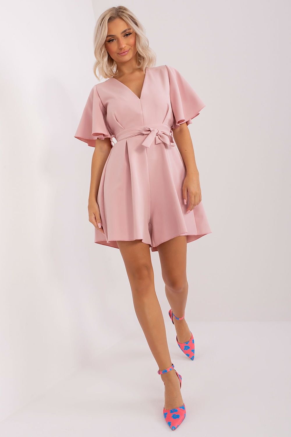 Summer jumpsuit with short sleeves and a heart neckline. There is a cutout on the back and a tie at the waist. A proposal ideal for many occasions.
