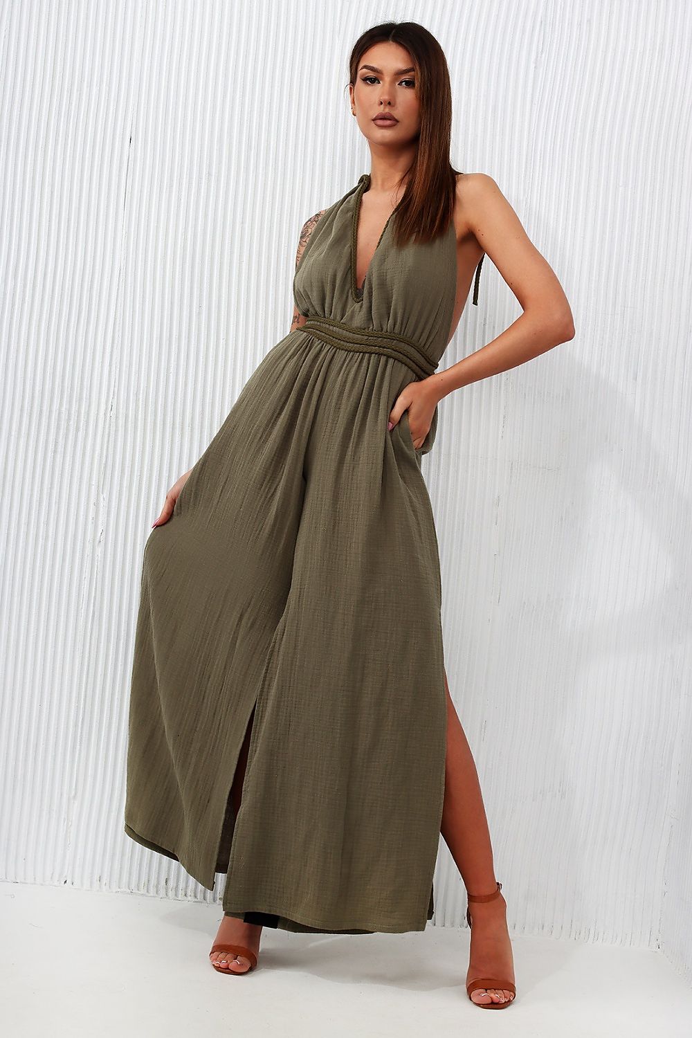 Muslin jumpsuit in khaki color distinguished by striking wide legs. The model on adjustable, tied straps. This proposal will present itself really phenomenal and elegant! It will prove itself for the hot summer.