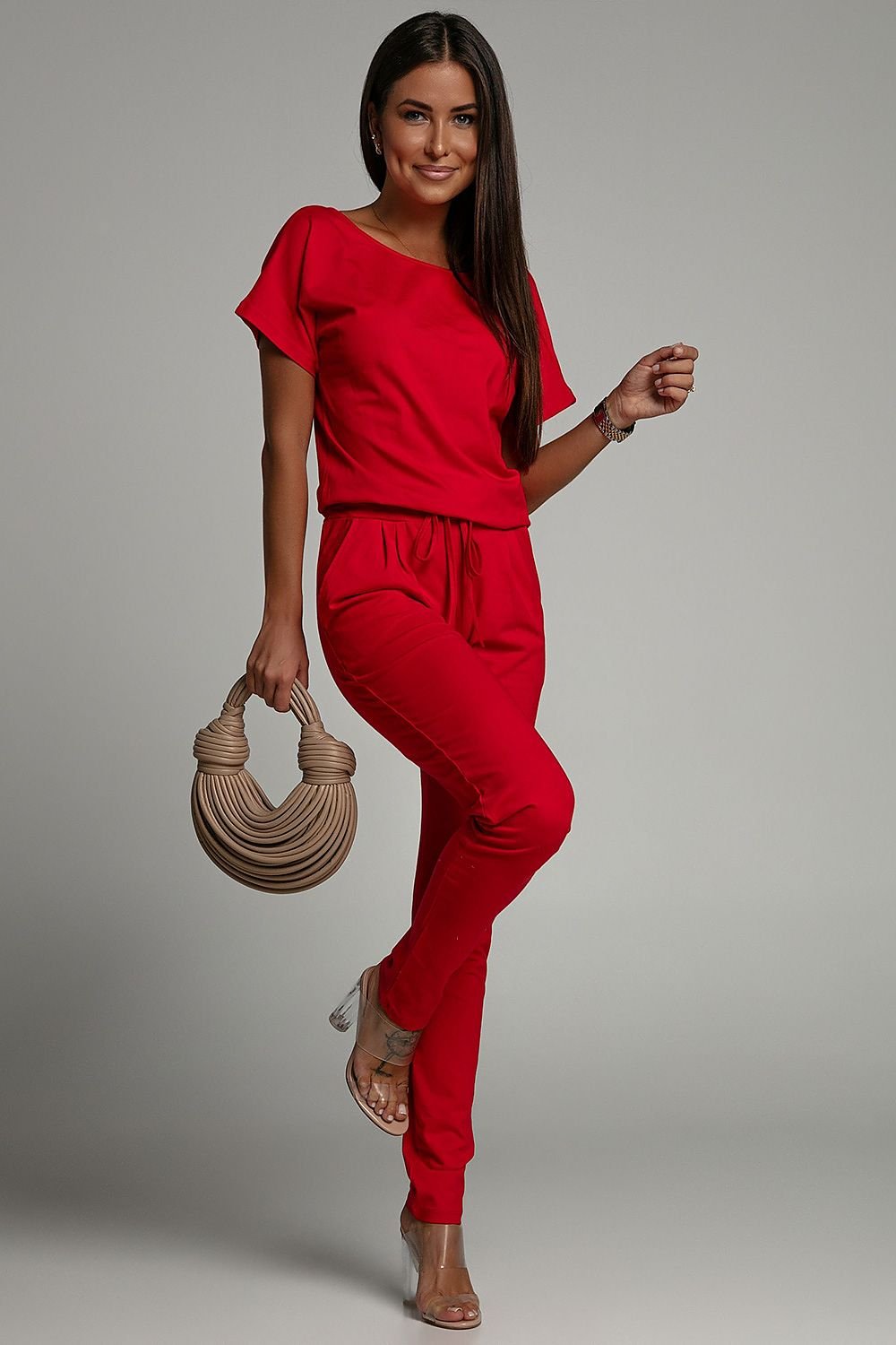 Red women's basic jumpsuit is a stylish and elegant choice for everyday or evening events. There is a decorative bow on the back, a tie at the waist, slip pockets on the sides. It will go perfectly with sports shoes as well as with elegant stilettos.