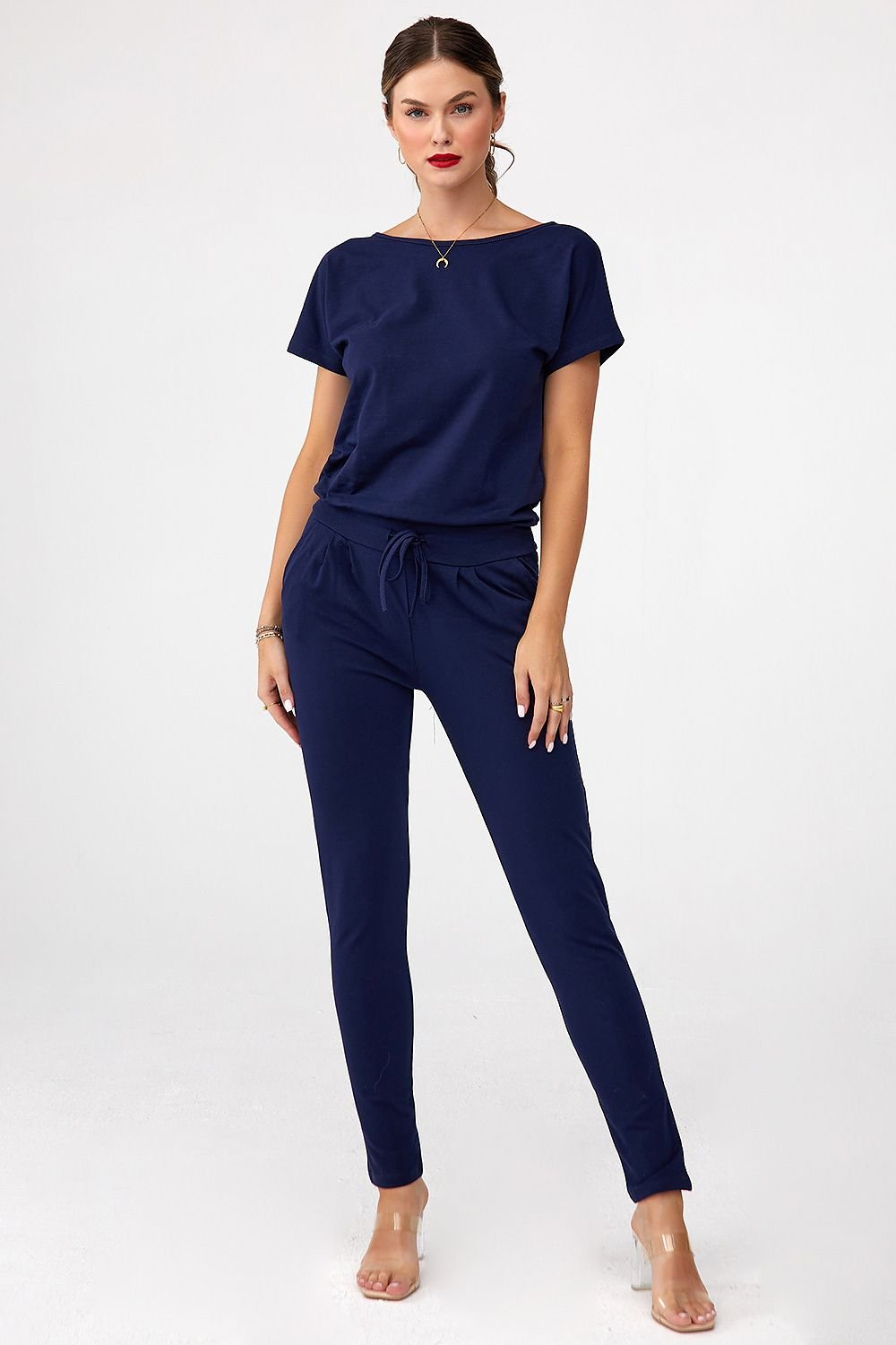 This navy blue women's basic jumpsuit is a stylish and elegant choice for everyday wear or an evening event. There is a decorative bow on the back, a tie at the waist, slip pockets on the sides. It will go perfectly with sports shoes as well as with elegant stilettos.