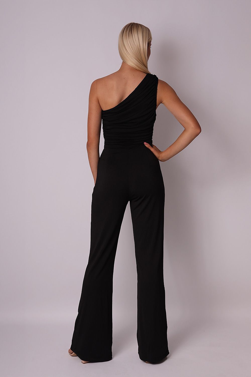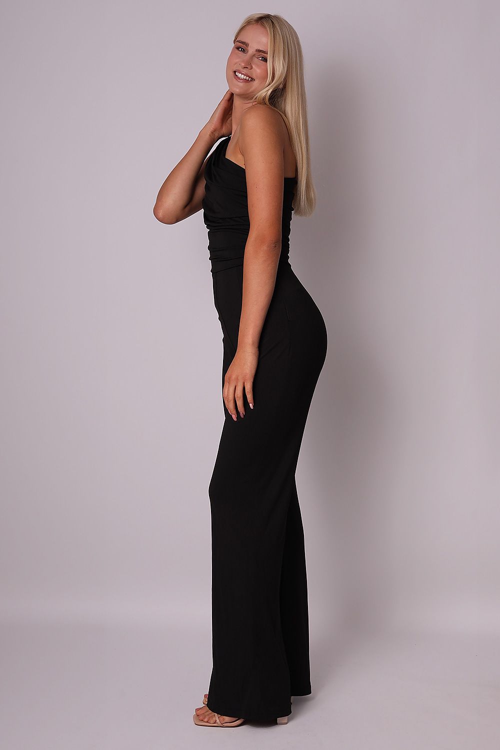 Extremely stylish and figure-enhancing, our black jumpsuit with one-shoulder ruffled top is the perfect date night look, made from our premium jersey fabric. It has a crisp one shoulder, a striking ruffled top, a side zipper and wide legs. Pair with flesh-colored strappy stilettos, a matching handbag and your favorite accessories for the most glamorous evening look!