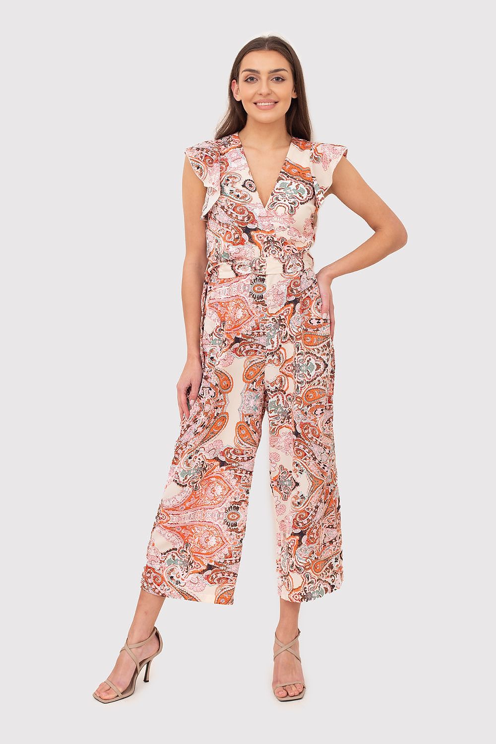 Short-sleeved jumpsuit with a frill trim and a tie belt. The jumpsuit has wide legs. It features an original colorful pattern.