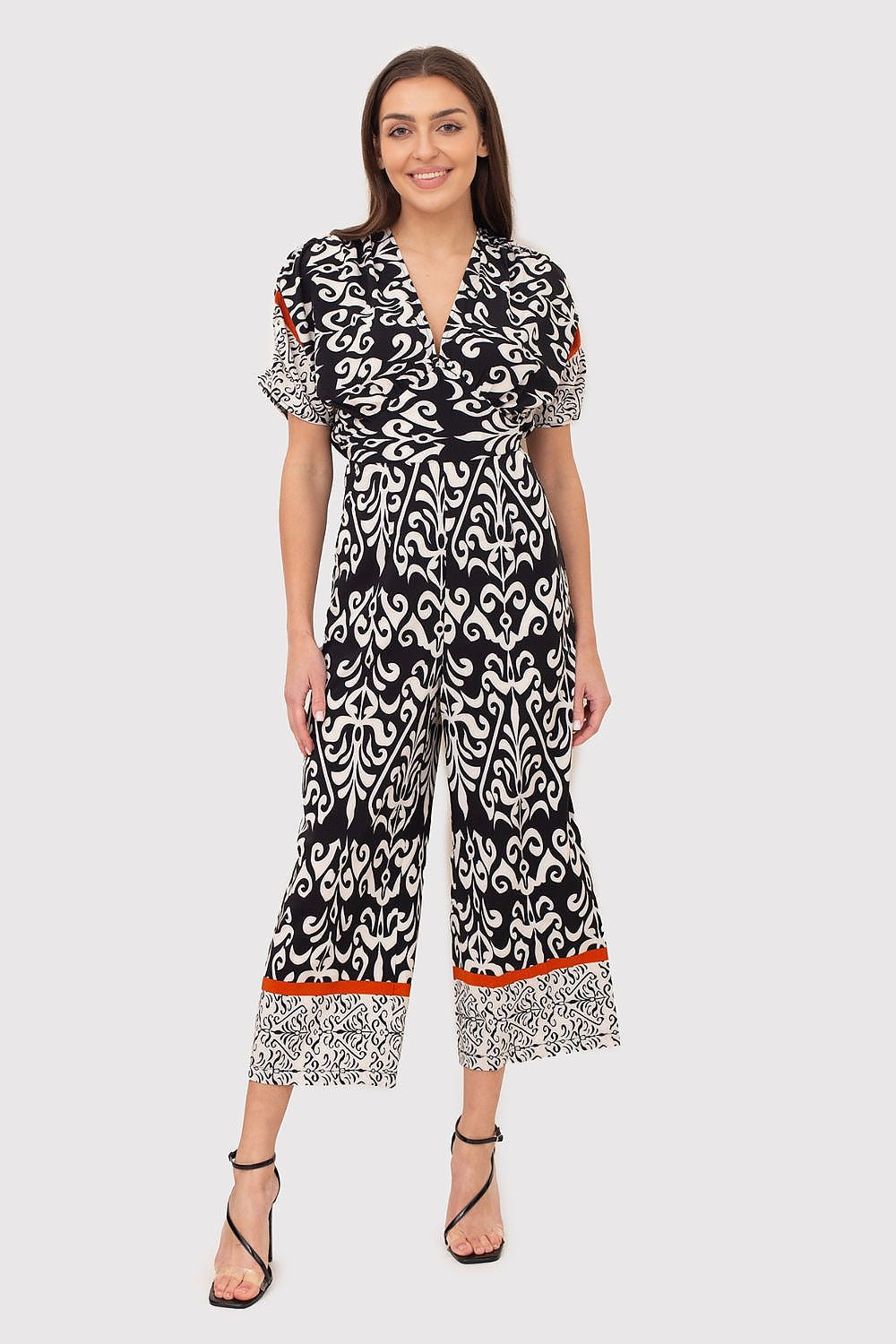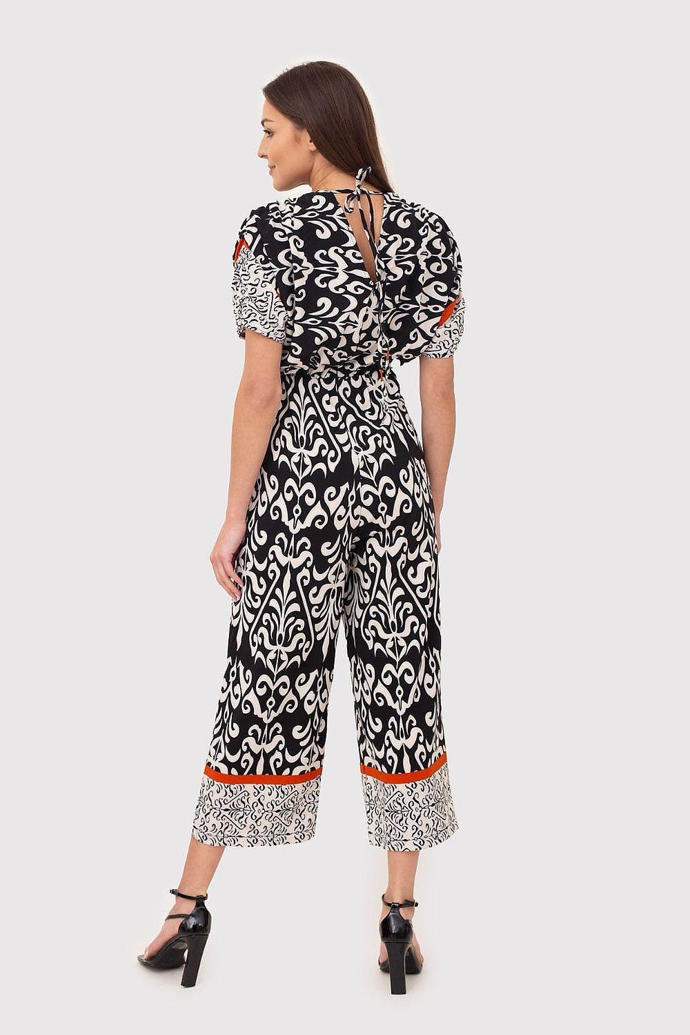 This black and cream jumpsuit is the perfect choice for vacation or casual wear. The jumpsuit features a scoop neckline, a zipper closure, short sleeves, a tie back and an elastic waistband.