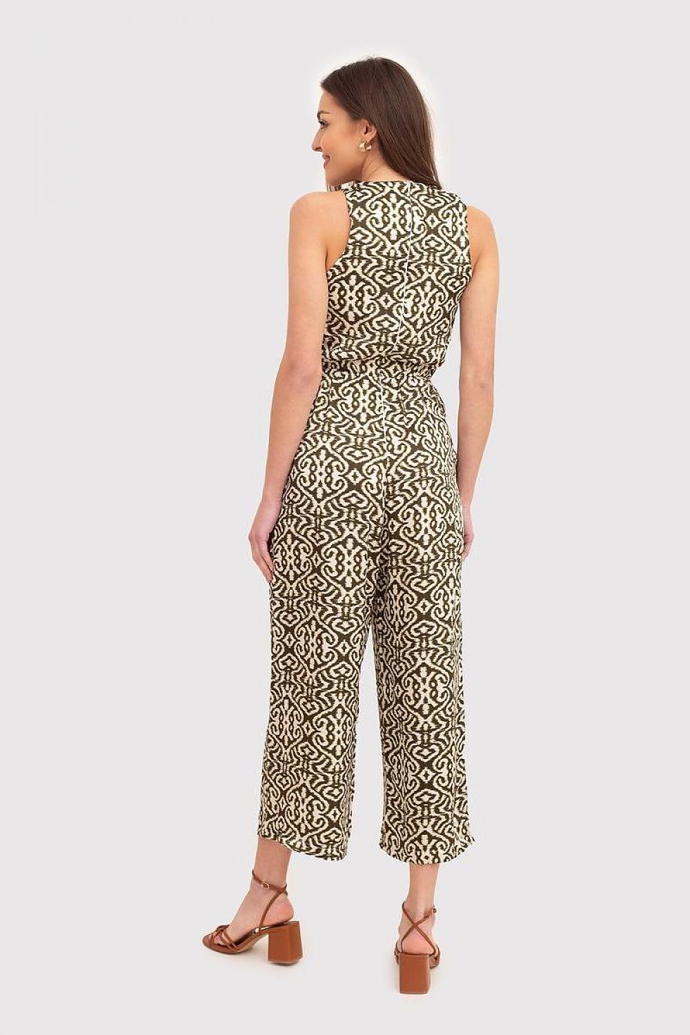 Sleeveless jumpsuit with tie front in khaki and cream color will work well in spring and summer. The jumpsuit is zippered at the back and has slip pockets.