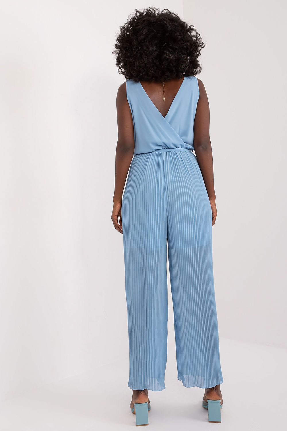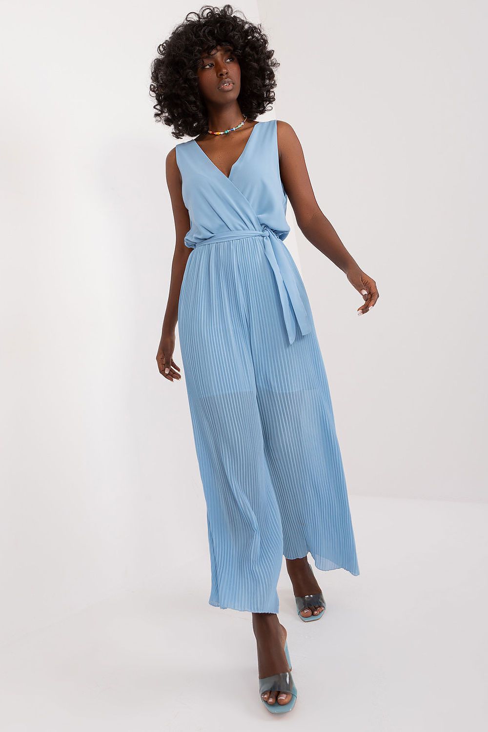 Summer sleeveless jumpsuit, has a lining. Jumpsuit with envelope neckline, pleated bottom, tie at waist. Perfect for many occasions.