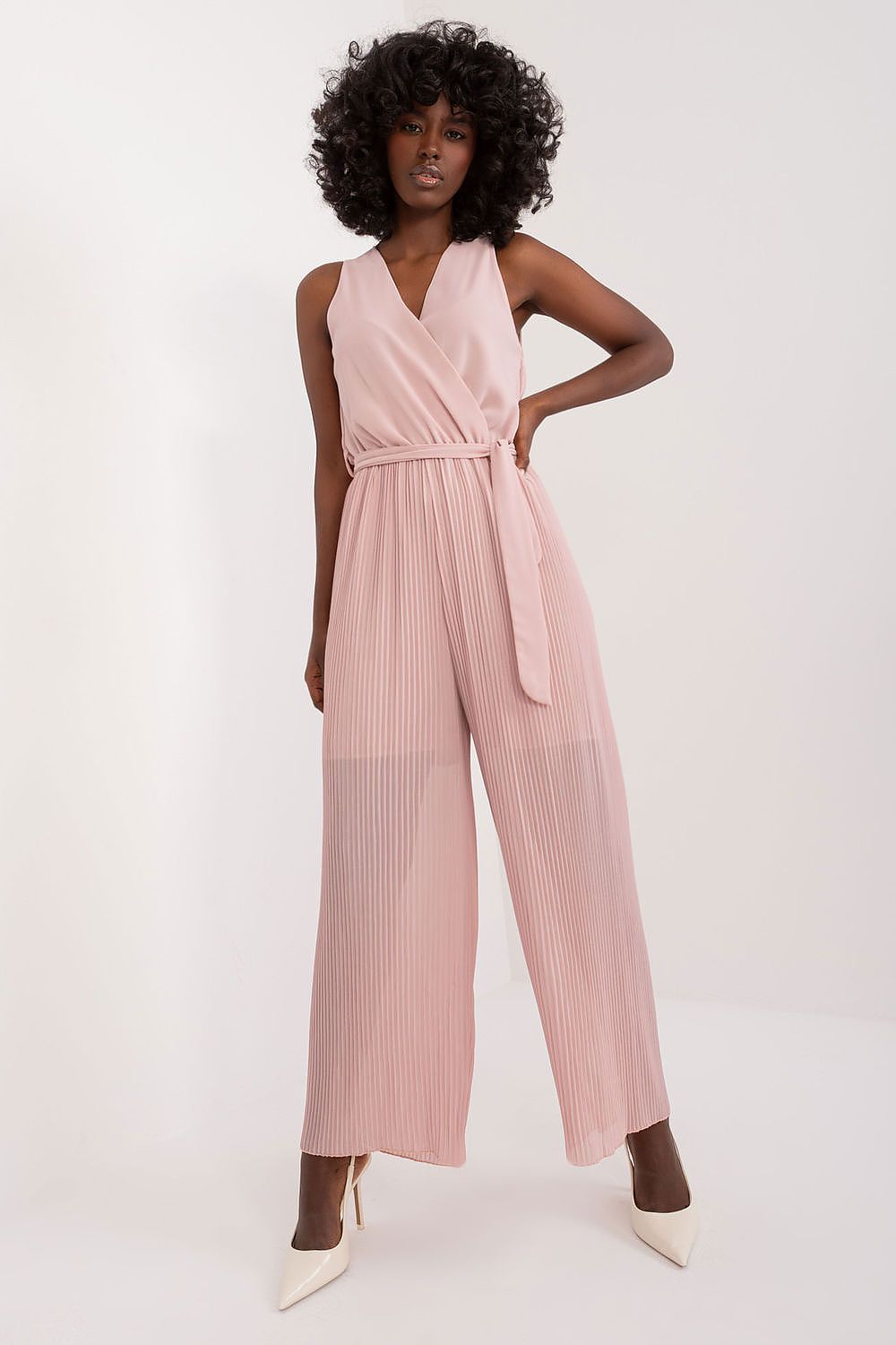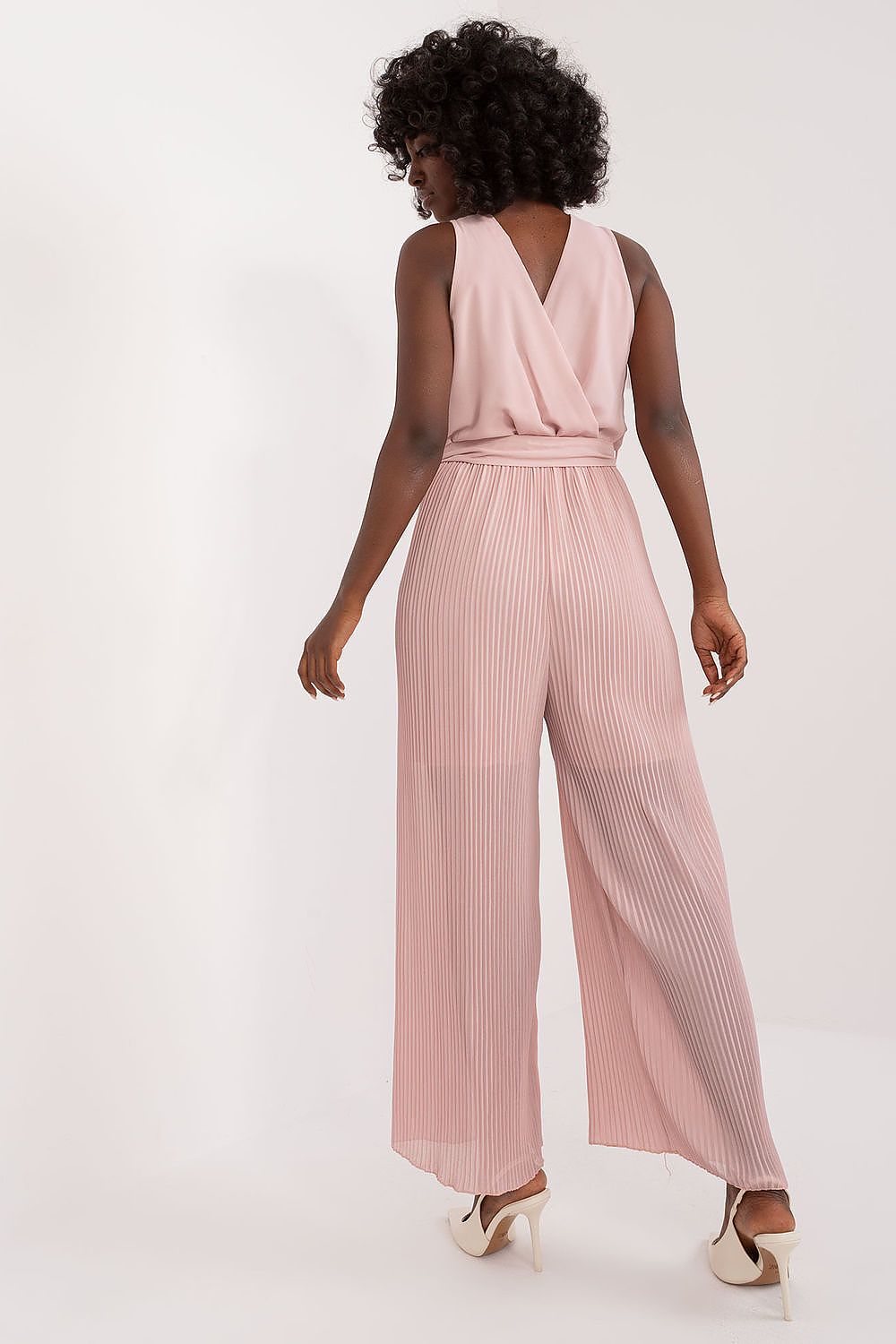 Summer sleeveless jumpsuit, has a lining. Jumpsuit with envelope neckline, pleated bottom, tie at waist. Perfect for many occasions.