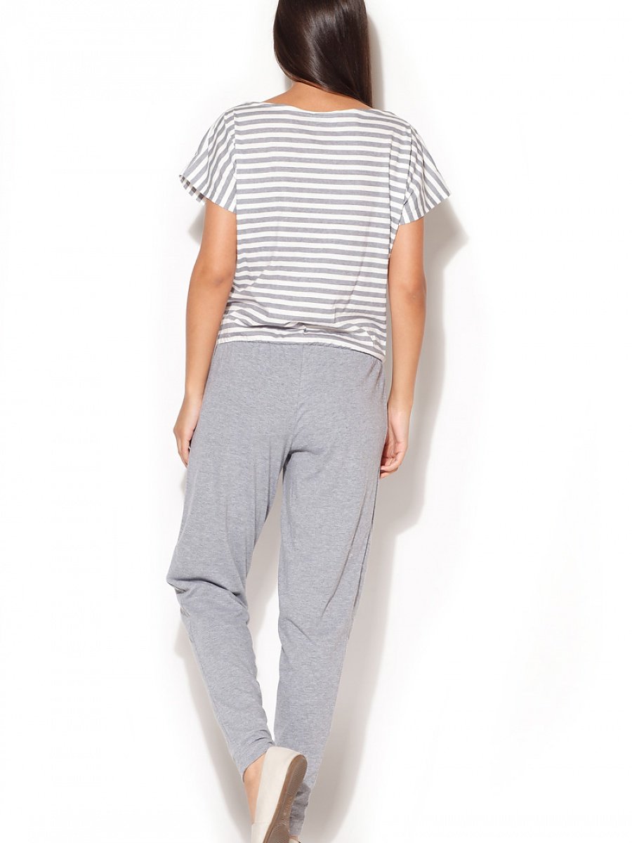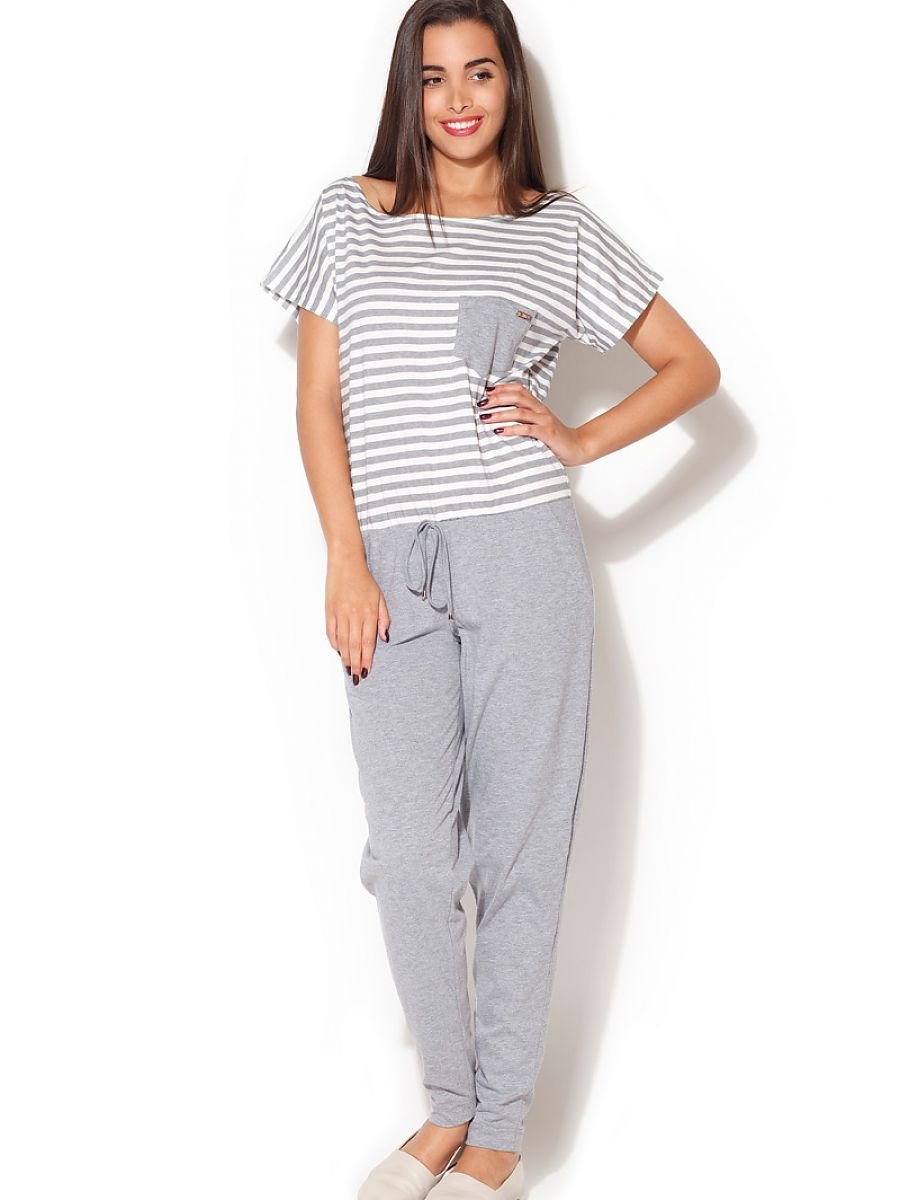 Set your sailing style course! Navy is one of the most versatile trends every summer. It comes back every year, usually slightly modified to suit the current fashion trends. However, stripes are always present (as an absolute staple). Short-sleeved cotton jumpsuit for women. The top is made of a navy stripe pattern and the bottom is plain. The neckline falls freely to the shoulders and there are pockets on the sides.