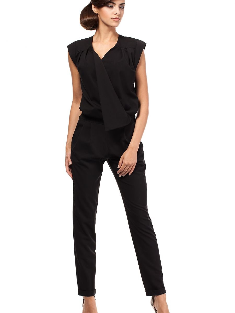 Sleeveless pantsuit with an envelope top, darts and pockets. Legs tapered at the bottom with cuffs. Covered zip at the side.