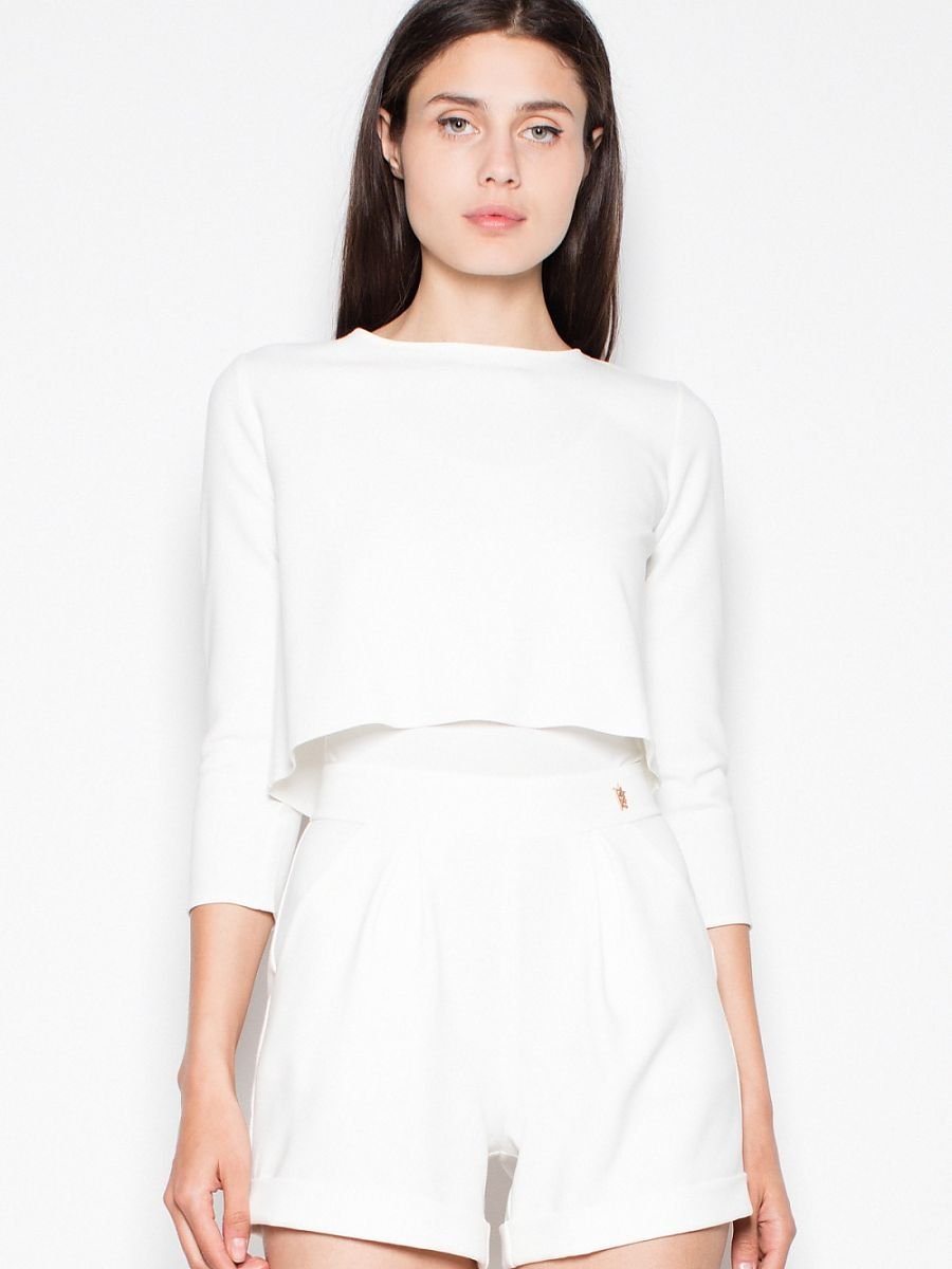 Elegant two-layer jumpsuit with short strapless shorts. The top with long sleeves, worn from the front, at the back fastened with a hook and eye fastener. The model with an original cut.