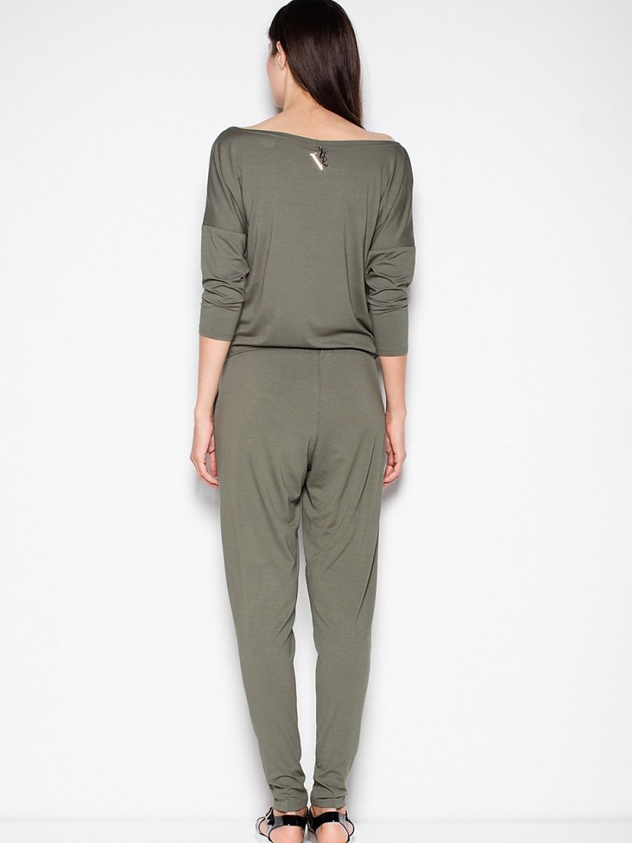 Sporty jumpsuit with a half-round neckline and dropped sleeves, cut off at the waist. Classic cut.