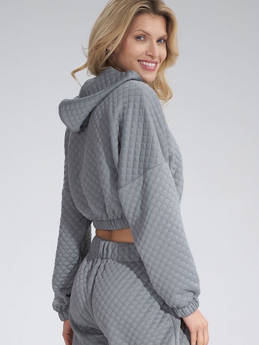 Short, sporty quilted hoodie. Long sleeve, piping at bust line, sewn-in elastic at waist and sleeves.