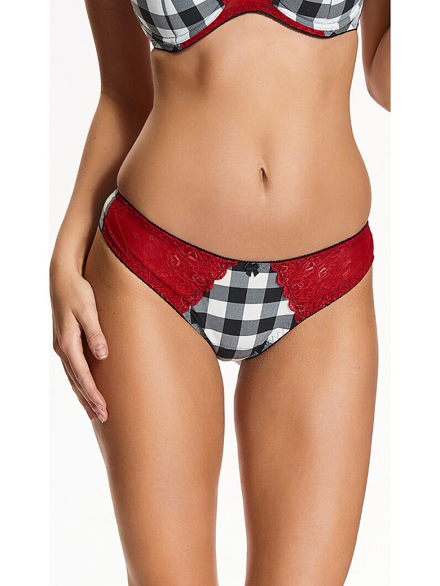 Thong made of high quality microfiber with checkered pattern, complemented by beautiful red lace trim.