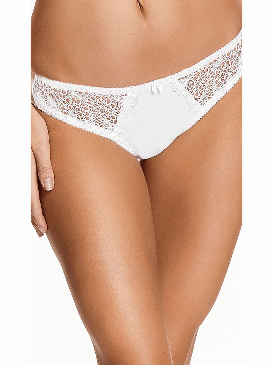 Elegant thongs. Made of high quality microfiber in ecru color, the front decorated with a beautiful openwork guipure. Subtle satin bow on front, in the middle.