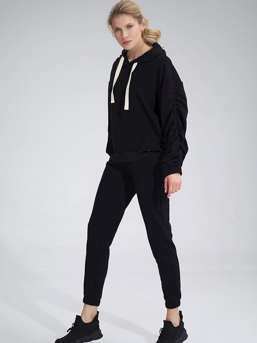 Cotton sweatpants. Wide rubber band on the waist. Legs finished with rubber. Without pockets.