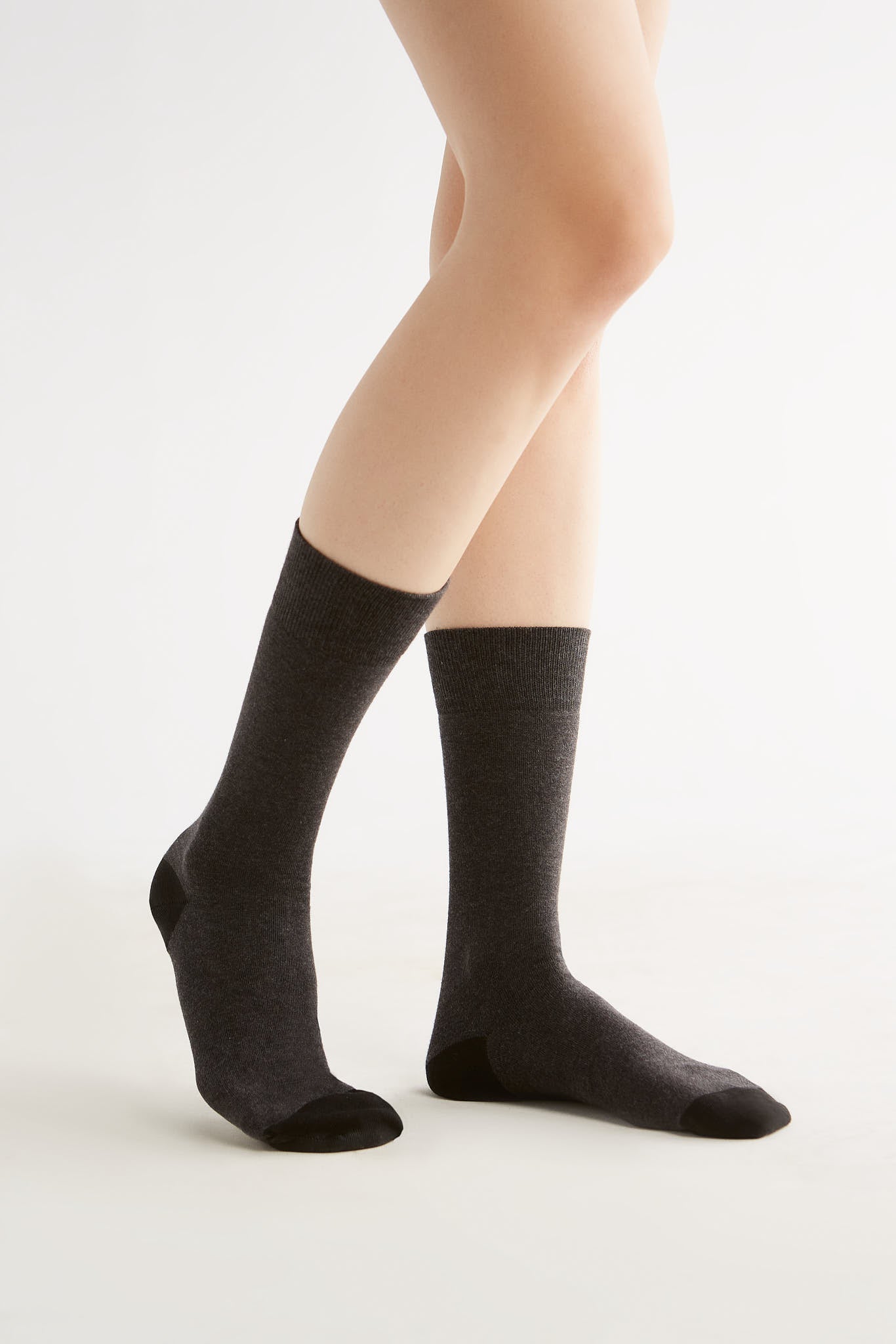 Hochwertig anthrazit-farbene Strümpfe in klassischer Strumpfhöhe aus 98% Bio-Baumwolle (kbA) und 2% Elasthan. Die Zehenkuppen, sowie Fersen sind Schwarz. Der bequeme Tragekomfort aus weichem Baumwolljersey wird abgerundet mit dem Elasthanfaden-Komfortbund, der ebenfalls schwarz ist. Nur im 6er Pack erhältlich.