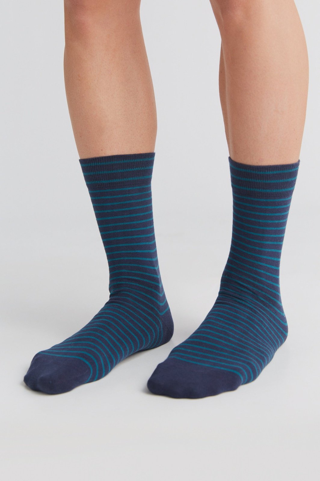 Hochwertig Strümpfe in Indigo mit petrolfarbenen Streifen, klassische Strumpfhöhe aus 98% Bio-Baumwolle (kbA) und 2% Elasthan. Der bequeme Tragekomfort aus weichem Baumwolljersey wird abgerundet mit dem Elasthanfaden-Komfortbund. Nur im 6er Pack erhältlich.