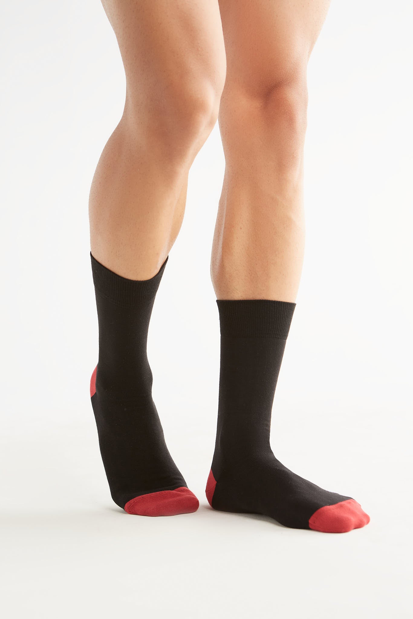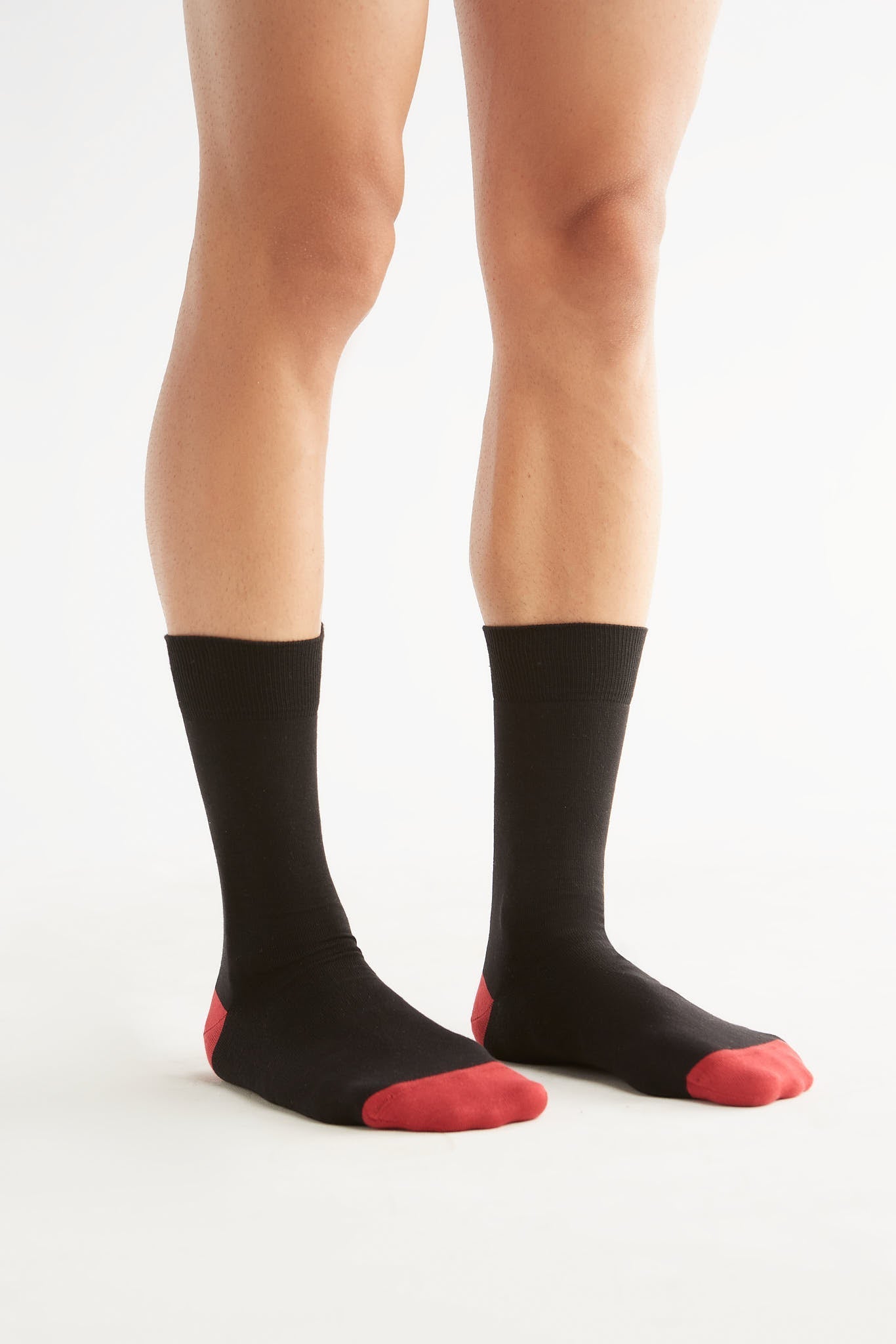 Hochwertig schwarze Strümpfe in klassischer Strumpfhöhe aus 98% Bio-Baumwolle (kbA) und 2% Elasthan. Die Zehenkuppen sowie Fersen sind in einem Kirschrot. Der bequeme Tragekomfort aus weichem Baumwolljersey wird abgerundet mit dem Elasthanfaden-Komfortbund.