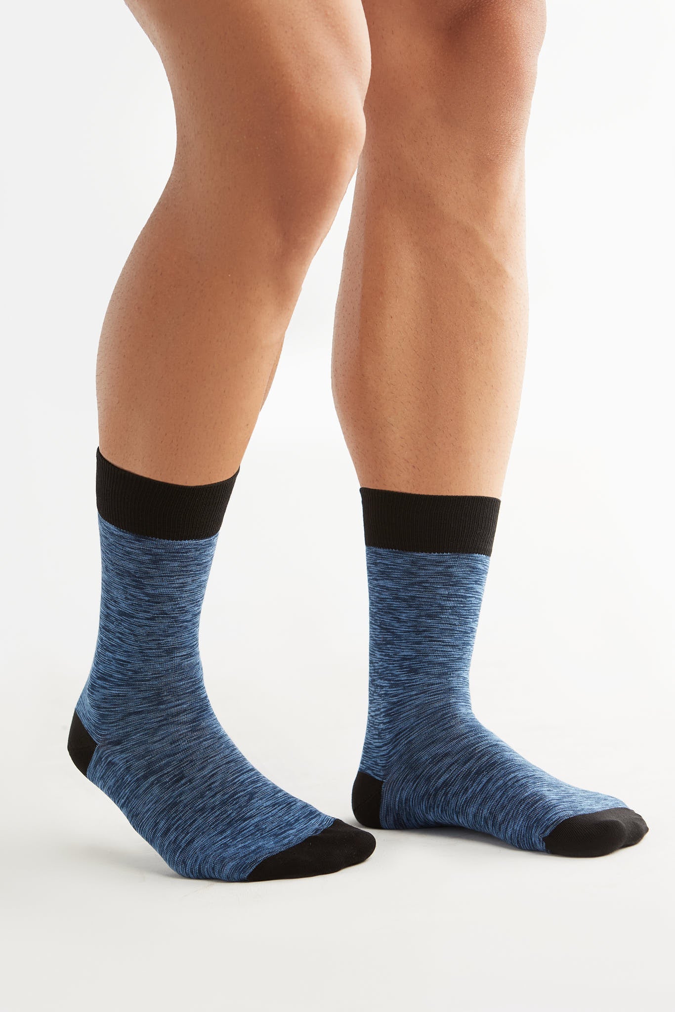 Hochwertig spaceultramarine Strümpfe in klassischer Strumpfhöhe aus 98% Bio-Baumwolle (kbA) und 2% Elasthan. Die Zehenkuppen, Fersen sowie der Bund sind in einem Schwarz. Der bequeme Tragekomfort aus weichem Baumwolljersey wird abgerundet mit dem Elasthanfaden-Komfortbund.