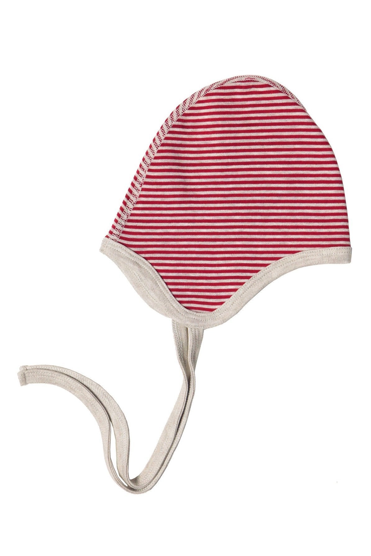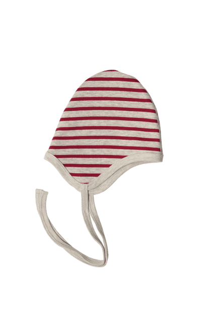 Eine Mütze - zwei Looks. Eine Mütze aus tollem doppelseitigem Interlockstoff, 100 % Bio-Baumwolle, in einem aufregenden Ziegelrot und Beige-Melange. Eine Seite ganz fein gestreift und die andere breit gestreift. Die Bänder zum binden, sichern den Schutz der zarten Kinderohren.