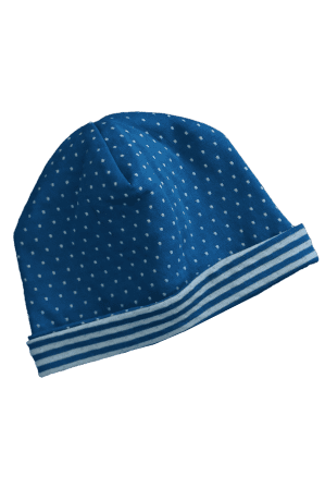 Eine Mütze - zwei Looks. Eine Mütze aus idealem doppelseitigen Interlockstoff, 100 % Bio-Baumwolle, in einem magischen Saphirblau und Naturweiß. Eine Seite fein gestreift und die andere gepunktet. Kopfumfang: 42cm, 44cm, 46cm