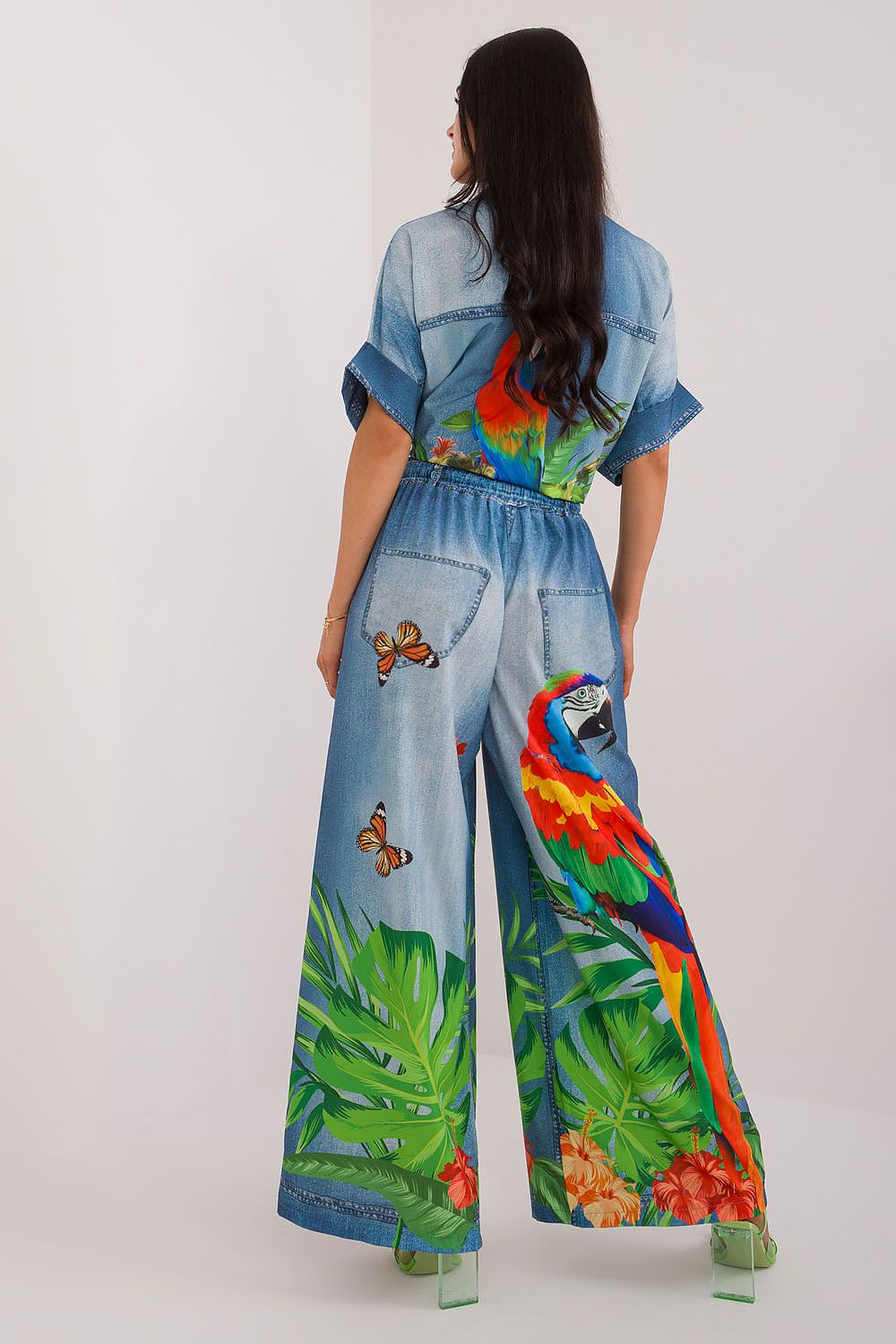 Stylish palazzo pants, ideal for everyday wear, made of lightweight material for comfort and freedom of movement. These casual pants are distinguished by a colorful print that adds a unique touch. Made of viscose, they are breathable and pleasant to the touch. They have a high waist, which emphasizes the waist, and wide legs, giving lightness and elegance to the silhouette. The tie ties at the waist allow for a customized fit, providing extra comfort. Perfect for everyday wear, they add style to any casual outfit.